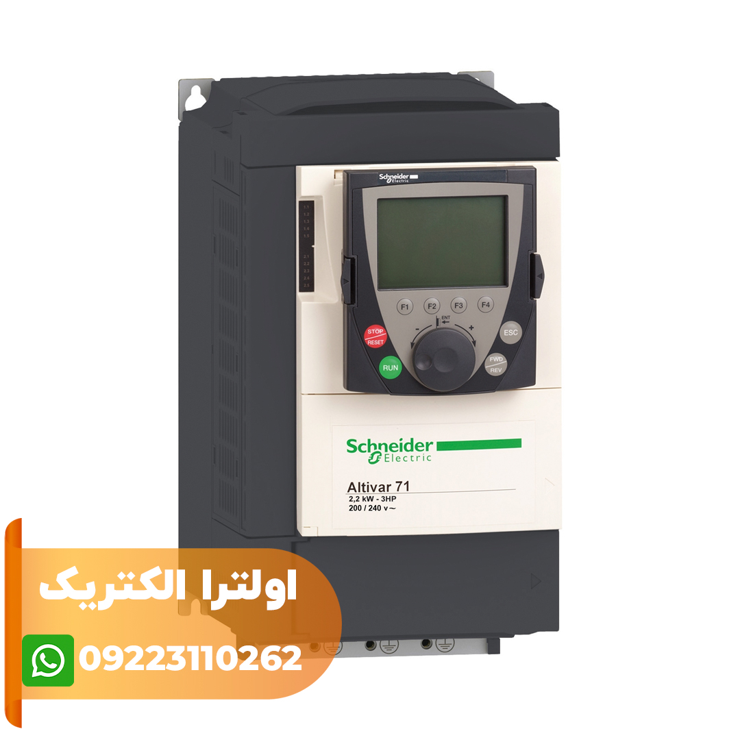 اینورتر یا درایو وسیله ای الکترونیکی است که در مسیر تغذیه موتور نصب می شود و سرعت موتور را کنترل می کند. اینورتر اشنایدر ATV71 با کد فنی ATV71HU40N4 موتورهای سنکرون و آسنکرون سه فاز را تغذیه می کند. اینورتر برق صنعتی دارای توان نامی 4 کیلو وات یا 5 اسب بخار و ولتاژ خروجی نامی 380 تا 480 ولت AC است. درجه حفاظت این کنترل دور IP20 است. در این درایو اینورتر صفحه نمایشی جهت نشان دادن وضعیت و خطا، یک دکمه چرخشی، یک عدد فیلتر EMC و هیت سینک تعبیه شده است. نمایشگر LED روی صفحه آن اطلاعات مورد نیاز کاربر را نمایش می دهد. اینورتر ATV71 با نرم افزار SoMove سازگار است. این درایو سرعت/فرکانس متغیر (VSD/VFD) برای فرآیندهای صنعتی و برای کاربرد سنگین طراحی شده و در بخش های مربوط با صنایع نفت و گاز، معدن، آب و فاضلاب و مواد غذایی استفاده می شود. درایو آلتیوار 71 عملکرد موتور را بهبود می دهد و با فیدبک به موقع، دستگاه کوپل شده را به خوبی کنترل می کند. اینورتر ATV71 را می توان از طریق پرتکل های ارتباطی EtherNet/IP و Modbus TCP از راه دور کنترل کرد. این قطعه برای نصب در حالت عمودی با خطای +/- 10 درجه روی بدنه موتور طراحی شده است.