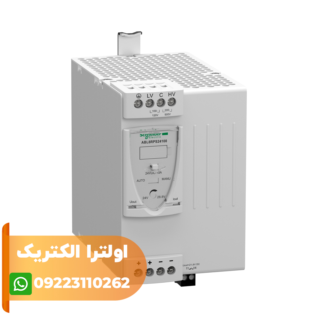 منبع تغذیه یا Power supply دستگاهی است که ولتاژ متناوب ورودی (AC) را به ولتاژ مستقیم (DC) تبدیل می‌نماید. از ویژگی اصلی منبع تغذیه می‌توان به تأمین ولتاژ و جریان موردنیاز مدار و پایداری ولتاژ و جریان دریافت شده از منبع تغذیه اشاره کرد. منبع تغذیۀ 240 وات ABL به منظور ایجاد ولتاژ کاملاً رگوله و سوئیچینگ به کار می‌رود و حداکثر رنج توان کاری که برای این محصول تعریف شده، 240 وات است. یعنی از این نمونه منبع تغذیۀ اشنایدر می‌توان به میزان 24 ولت DC و 10 آمپر جریان دریافت نمود. خروجی این نمونه منبع تغذیۀ ABL به صورت کوپلینگ سری–موازی است. نوع اتصالات در این قطعه به صورت ترمینال پیچی است. این منبع تغذیه دو نشانگر LED دارد که یک نمایشگر LED سبز و قرمز برای نشان دادن ولتاژ خروجی و یک نمایشگر LED سبز، قرمز و نارنجی برای نمایش جریان خروجی به کار می‌رود. این نمونه منبع تغذیۀ اشنایدر به دلیل بهبود در اندازه، وزن، کارکرد، هزینه و ایجاد ولتاژ کاملاً رگوله بیشترین کاربرد را در مصارف صنعتی دارد. از منابع تغذیه سوئیچنگ که از نظر نویز پذیری حفاظت شده هستند برای تأمین تغذیۀ قطعات حساس به نوسانات ولتاژ مانند انواع سنسورها، PLC‌ها قطعات ابزار دقیق و… استفاده می‌شود.