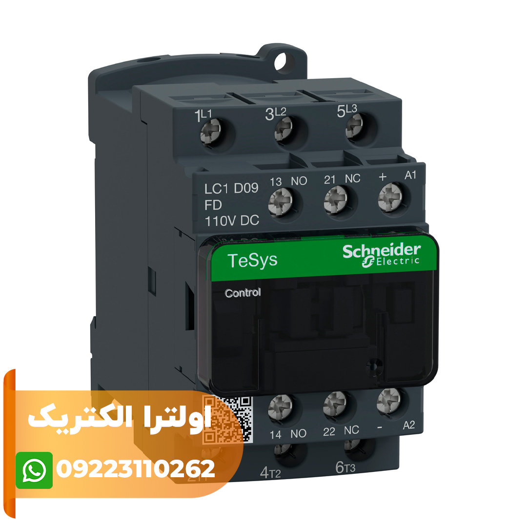 کنتاکتورهای DC توسط برق DC تغذیه می شوند. در واقع تفاوت کنتاکتورهای DC و AC در نوع تغذیه بوبین آن ها است. معمولاً استفاده از کنتاکتورهای DC در کاربردهای ولتاژ پائین پیشنهاد می شود. علت آن، میدان مغناطیسی با قدرت کمتر و ایجاد نشدن حلقه هیسترزیس در کنتاکتورهای DC نسبت به مدل AC است. این ویژگی موجب سر و صدا و نویز و ارتعاش کمتر کنتاکتورهای DC در هنگام قطع و وصل آن ها می شود. کنتاکتور اشنایدر LC1D09FD یک کنتاکتور DC با ولتاژ تغذیه بوبین 110 ولت است. ترکیب کنتاکت های کمکی این تجهیز به صورت 1NO+1NC است که در استانداردهای AC-1، AC-3 و AC-4 کاربرد دارد. مطابق با استاندارد AC-3 جریان کاری این کنتاکتور، 9 آمپر است. رنج ولتاژ عملکردی این کنتاکتور برای مدار قدرت در حالت DC برابر با 300 ولت و در حالت AC برابر با 690 ولت در رنج فرکانسی 25 تا 400 هرتز است.